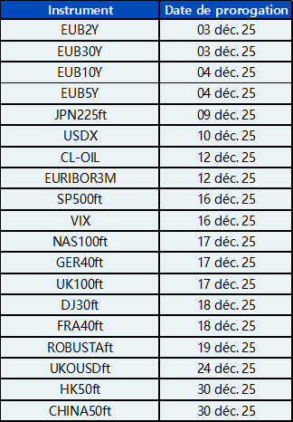 Nous vous informons que les instruments CFD suivants seront automatiquement reconduits aux dates indiquées dans le tableau ci-dessous. Comme il peut y avoir une différence de prix entre les anciens et les nouveaux contrats à terme, nous recommandons aux clients de suivre de près leurs positions et de les gérer en conséquence.
