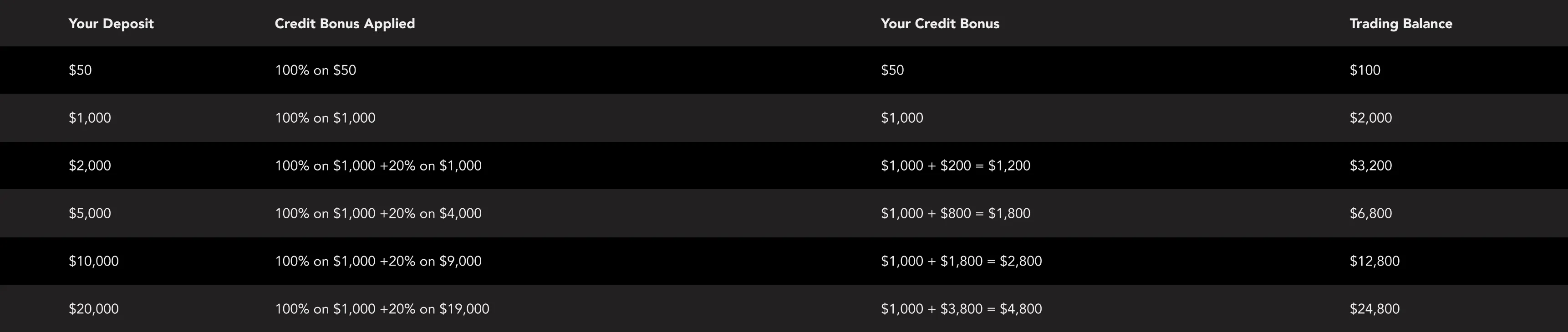 Table of example of this “100% Deposit Bonus”:
