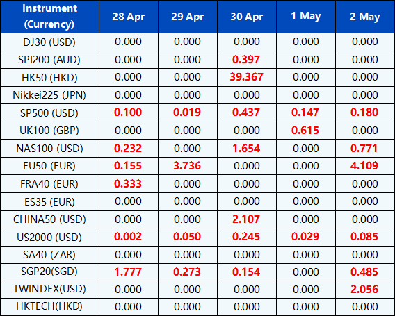 Please be advised that the dividends of the following index CFDs will be adjusted by upcoming ex-dividend dates. The comment for trading index CFDs will be in the following format “Div&<Product Name>&<Net Volume>” which show in the balance after the close of the day before the dividend payment date.