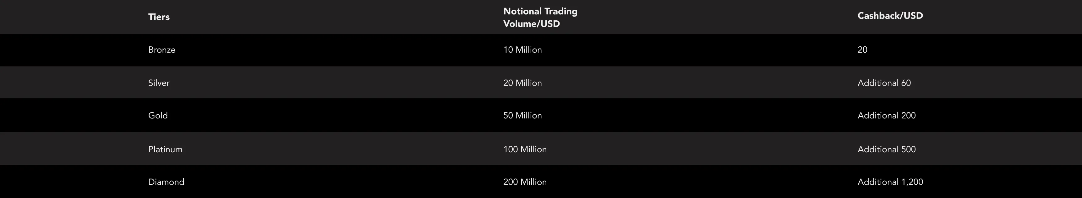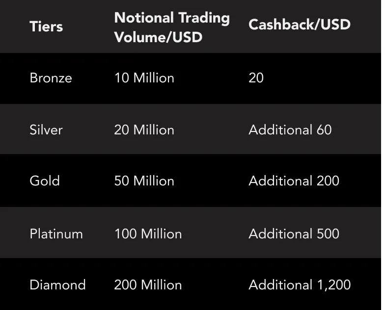 • b.During the promotion period, once your total Notional Trading Volume across all trading products meets the required threshold, you will receive the corresponding cashback in a lump sum. Please refer to the table below for reward details:
