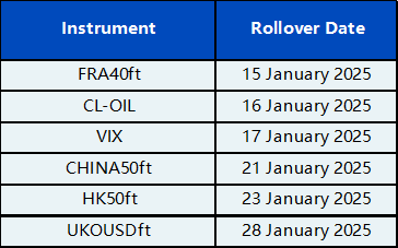 Please be advised that the following CFD instruments will be automatically rolled over as per the dates in the table below. As there can be a pricing difference between old and new futures contracts, we recommend clients to monitor their positions closely and manage positions accordingly.