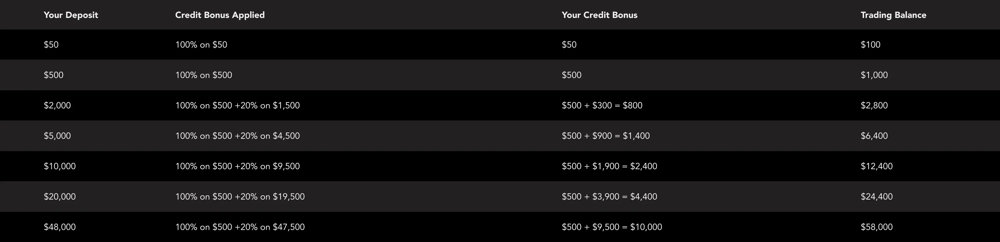 *Any profits generated from closed orders can be withdrawn at any time. However, withdrawing any portion of your original deposit will result in the proportional removal of your credit bonus. Transferring funds between your trading accounts is also considered withdrawal.