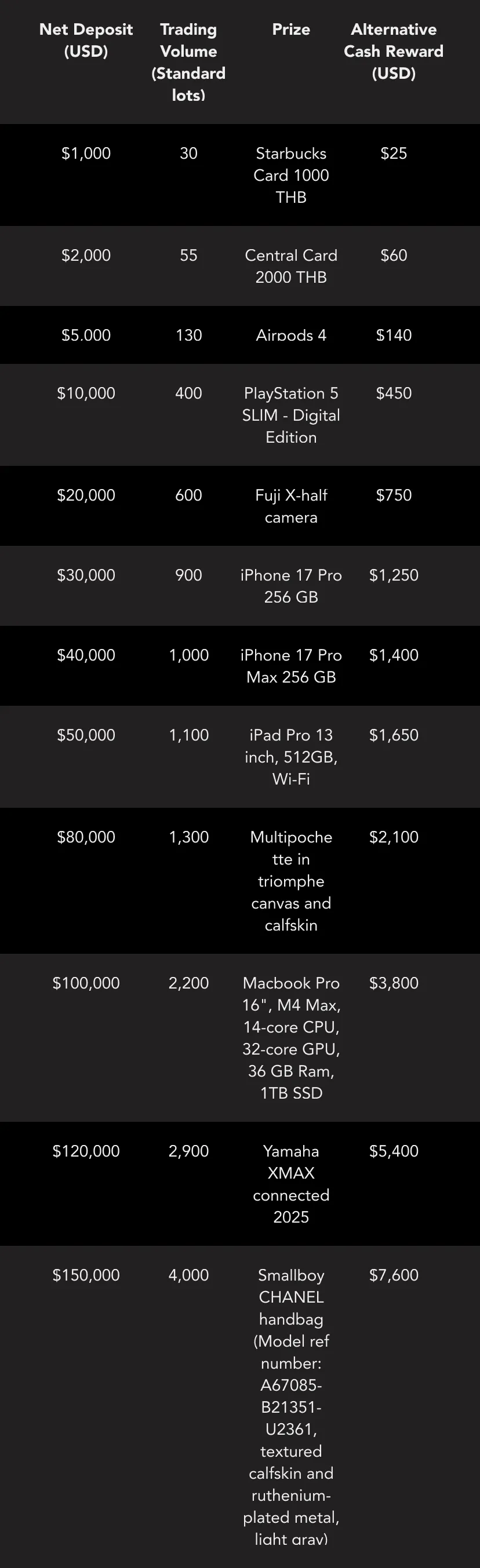 6.During the promotion, clients must meet the required thresholds for both new deposits and trading volume within each tier to qualify for the prize. Clients can apply to receive the corresponding gifts, after the promotion ends. Each client can only redeem one gift.